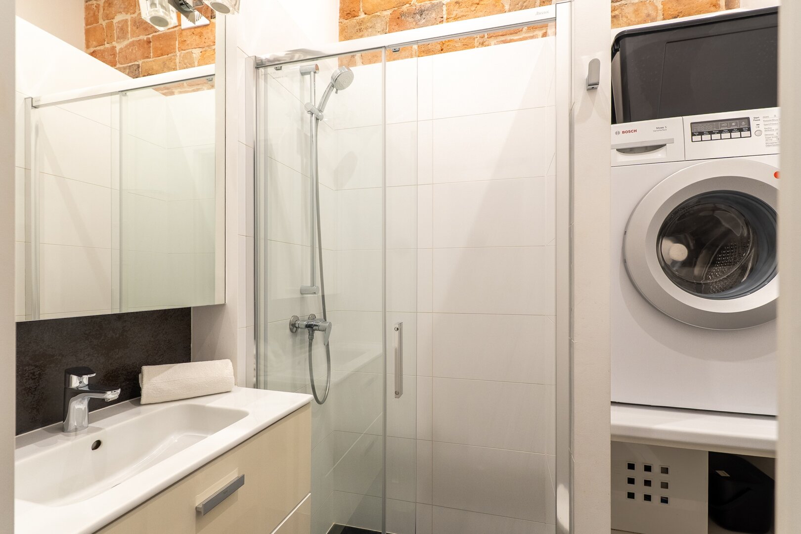 The living room has a sofa bed, TV with basic channels and Netflix applications. Fully equipped kitchen and bathroom with shower