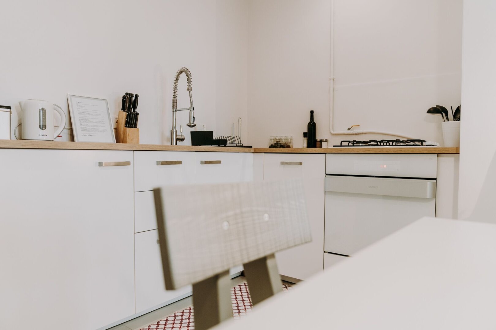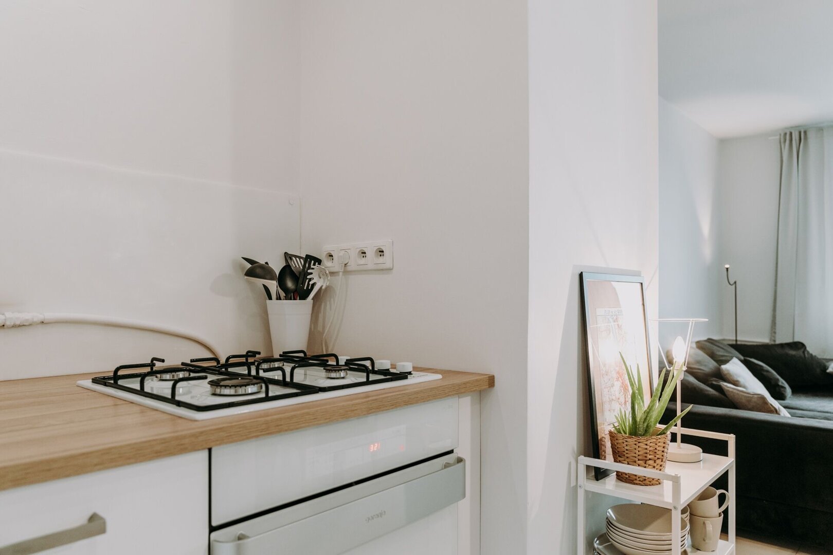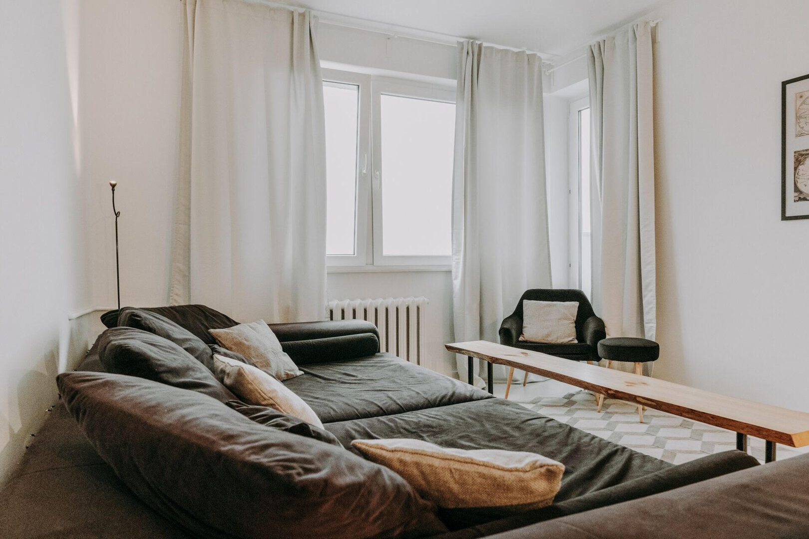 Stylowe mieszkanie w klimatycznej kamienicy na terenie Śródmieścia, tuż przy Starym Rynku. Wnętrze łączy styl retro z nowoczesnymi akcentami — wysokie sufity, duże okna i starannie dobrane detale tworzą elegancką, przytulną przestrzeń. Salon z aneksem kuc