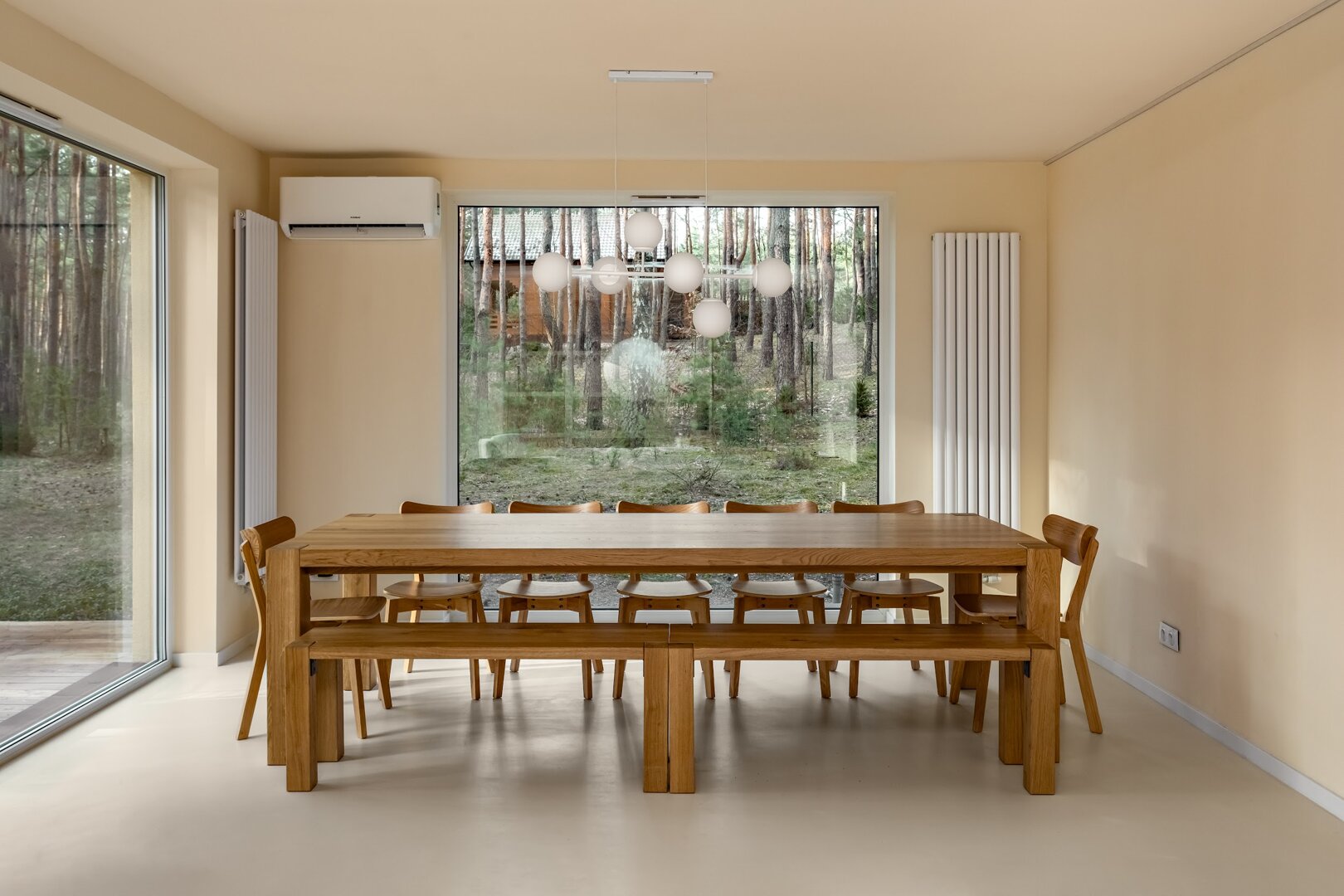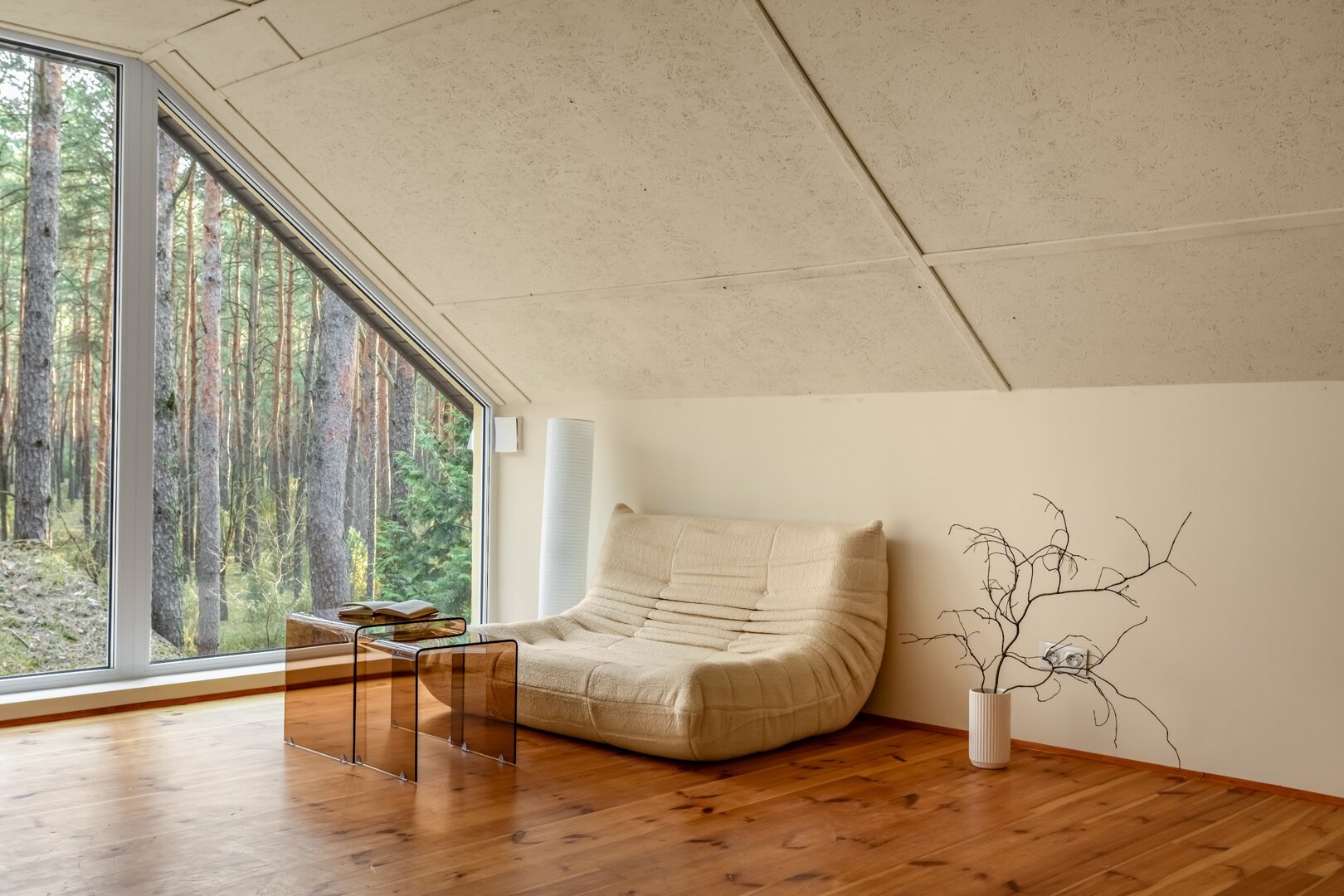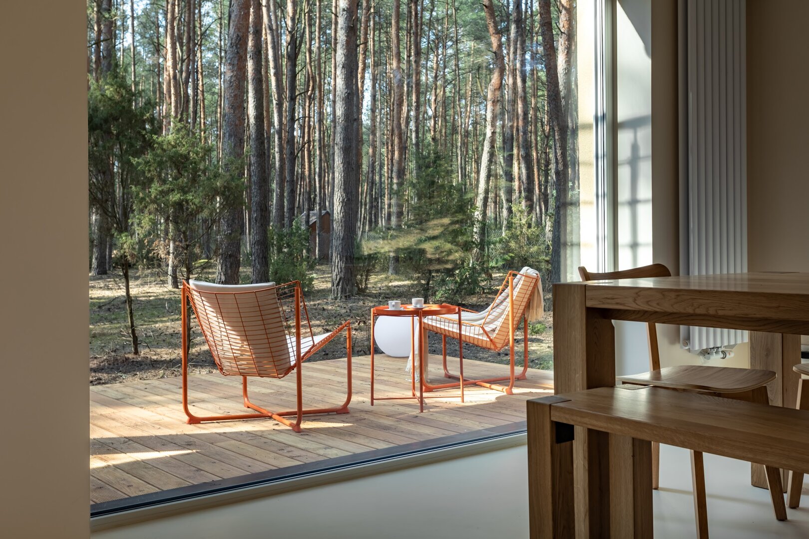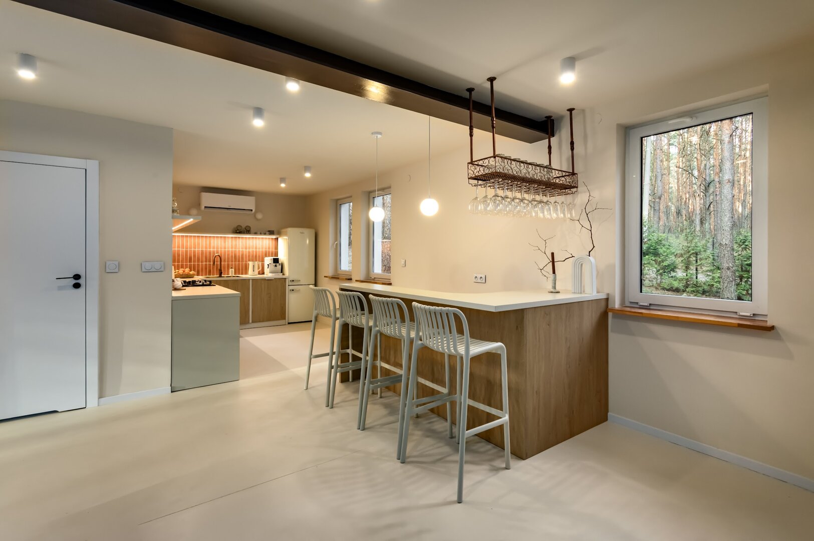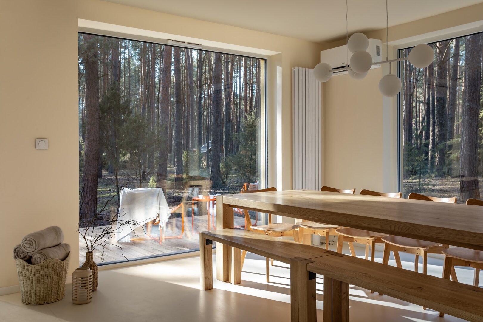 To przestrzeń idealna na warsztaty jogowe, wyjazdy rozwojowe, kameralne retreaty czy spokojne wyjazdy integracyjne. Duże przeszklenia otwierają wnętrze na las, a naturalne materiały i stonowana estetyka pomagają się wyciszyć. Tu dzień zaczyna się od kawy na tarasie i śpiewu ptaków, a kończy przy ciepłym świetle i rozmowach bez pośpiechu.