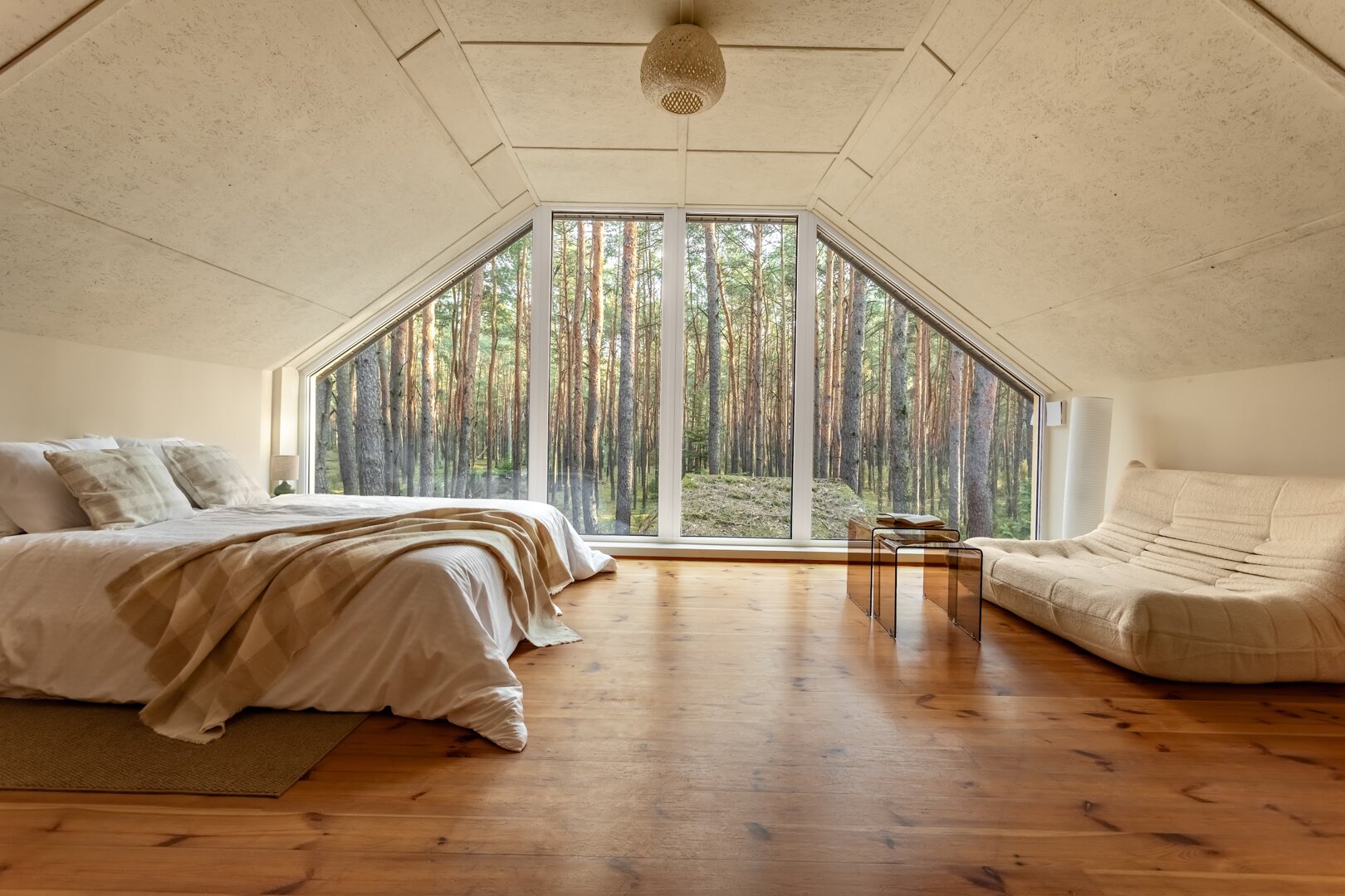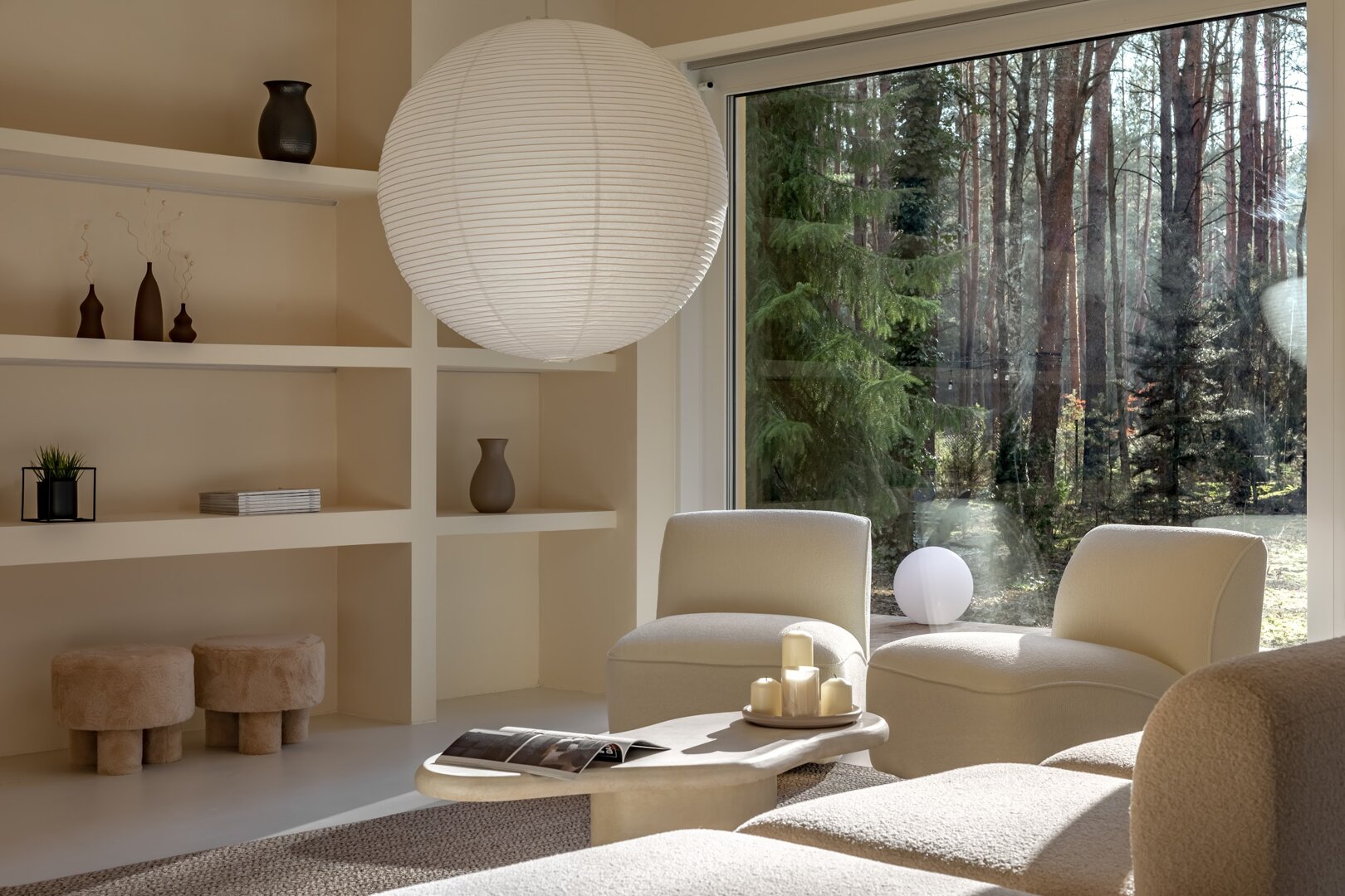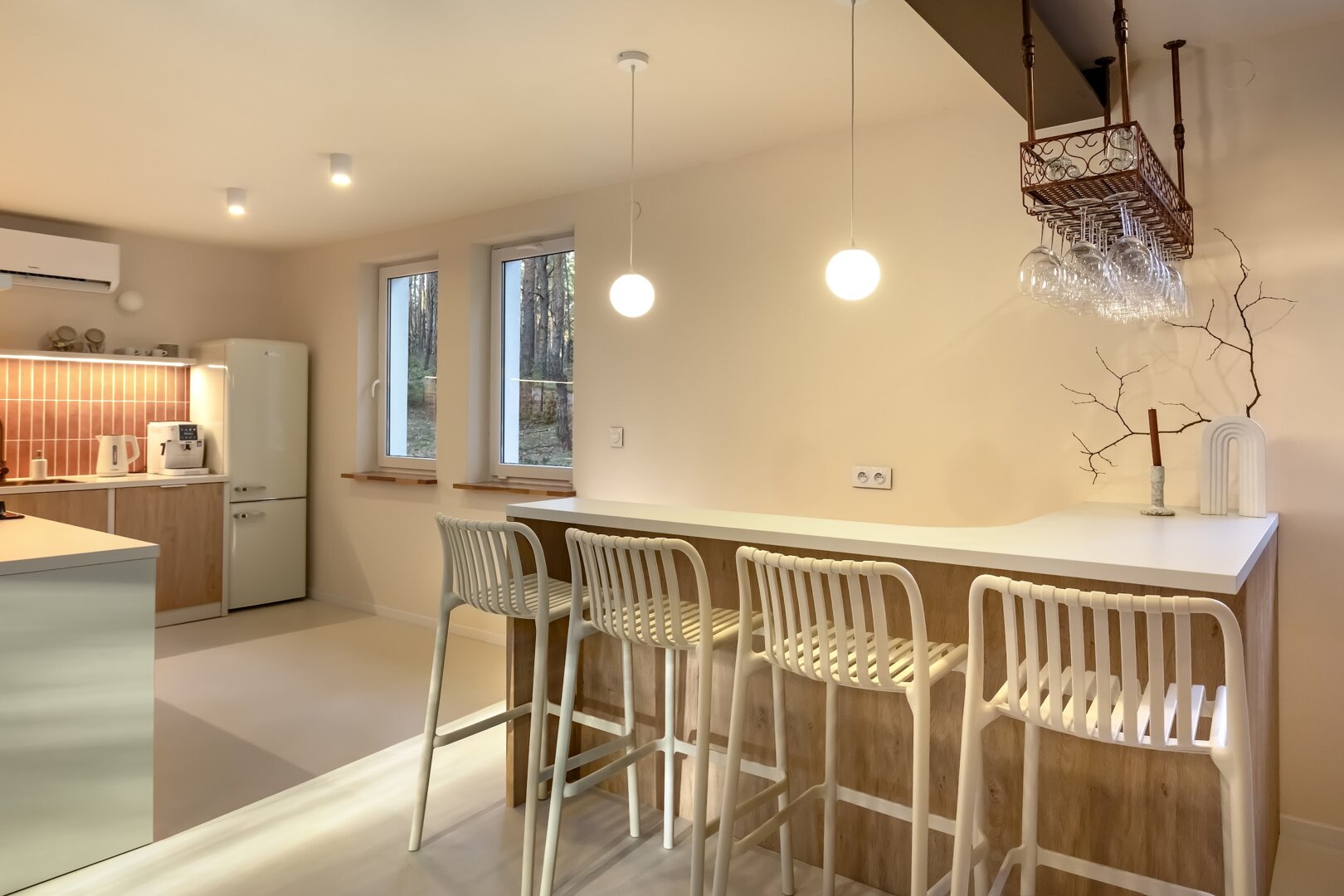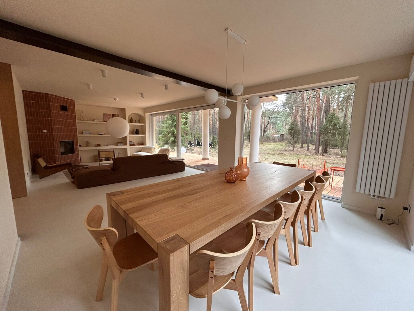 To przestrzeń idealna na warsztaty jogowe, wyjazdy rozwojowe, kameralne retreaty czy spokojne wyjazdy integracyjne. Duże przeszklenia otwierają wnętrze na las, a naturalne materiały i stonowana estetyka pomagają się wyciszyć. Tu dzień zaczyna się od kawy na tarasie i śpiewu ptaków, a kończy przy ciepłym świetle i rozmowach bez pośpiechu.