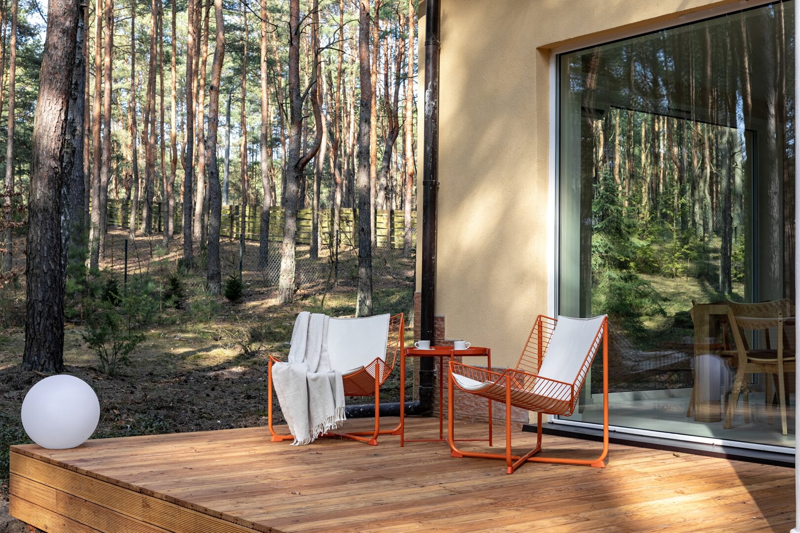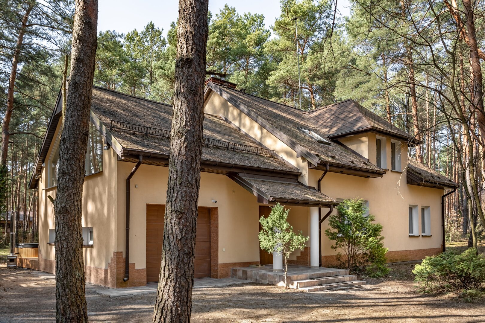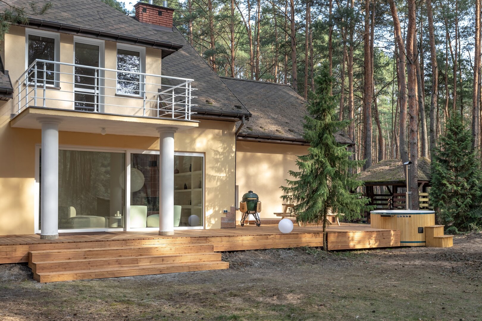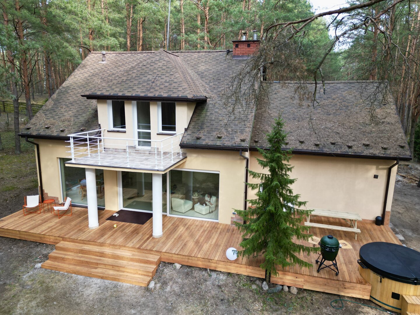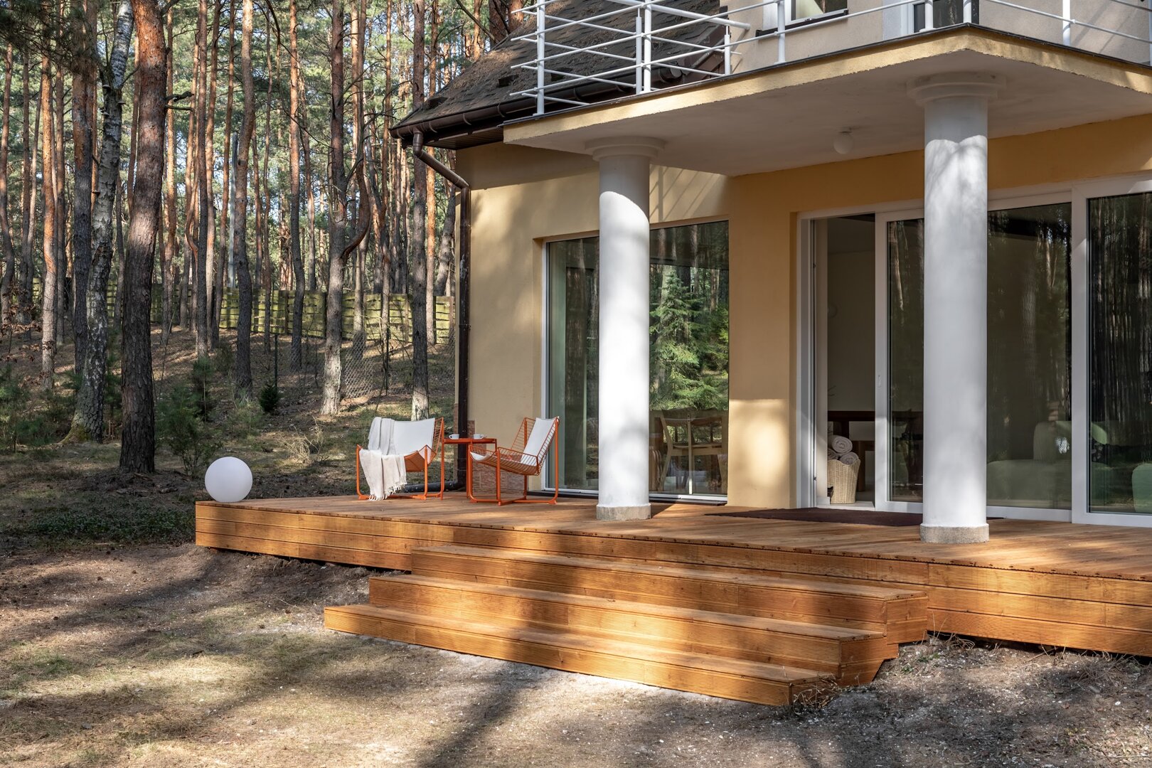 Dom stoi na ogrodzonej działce otoczonej lasem, co daje poczucie prywatności i bezpieczeństwa. Wokół nie ma zgiełku – jest za to przestrzeń na oddech, ruch i bycie tu i teraz.