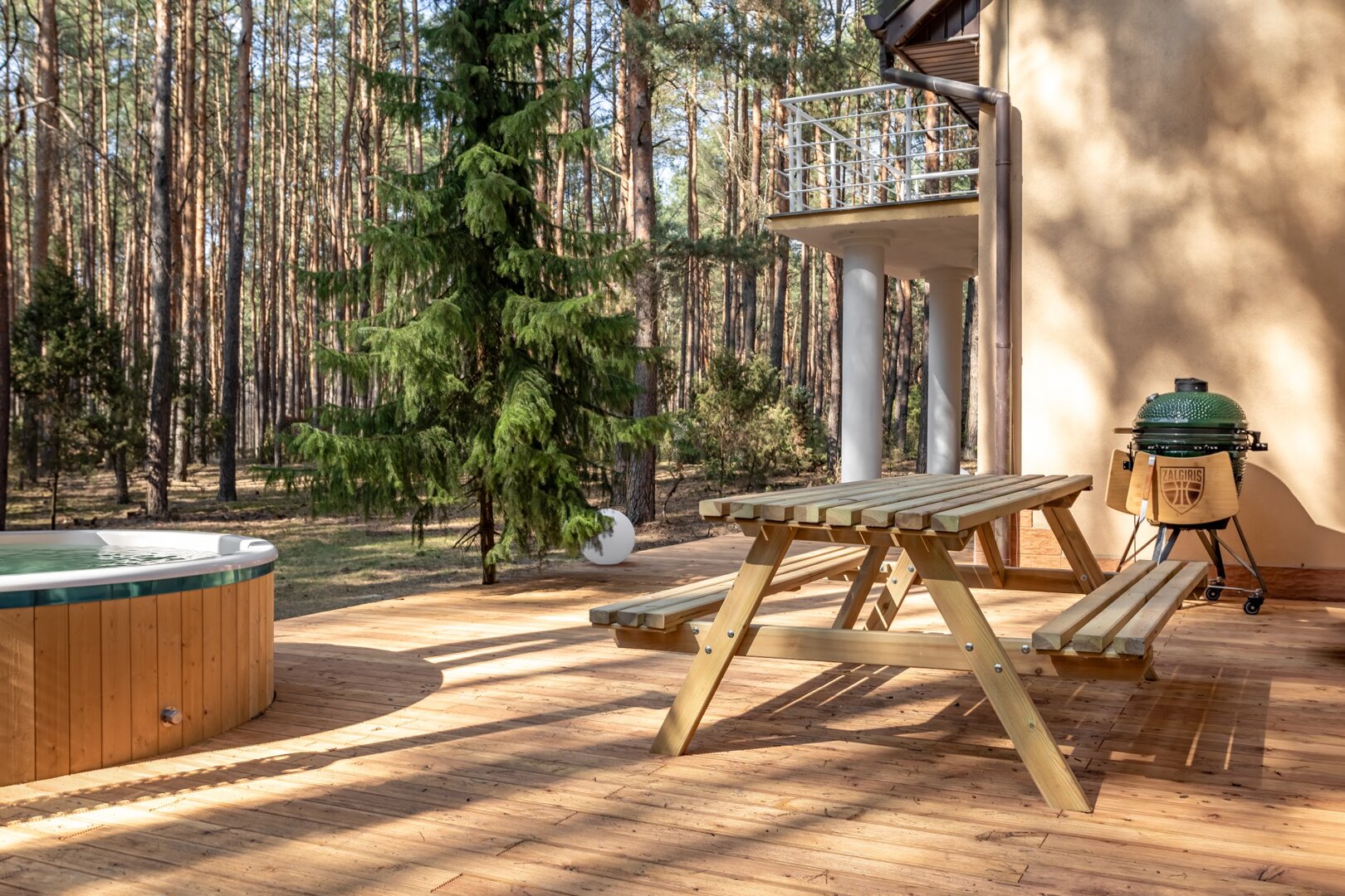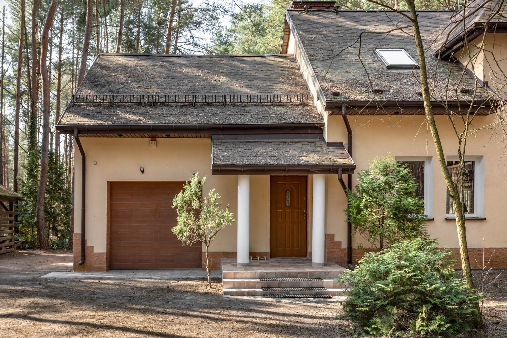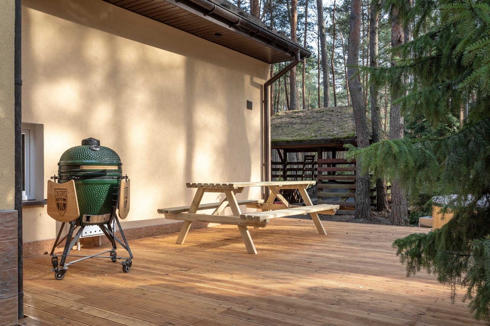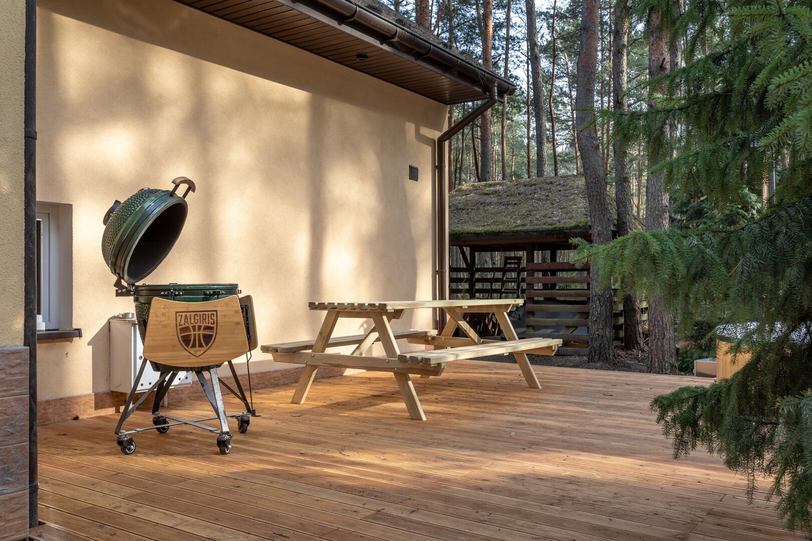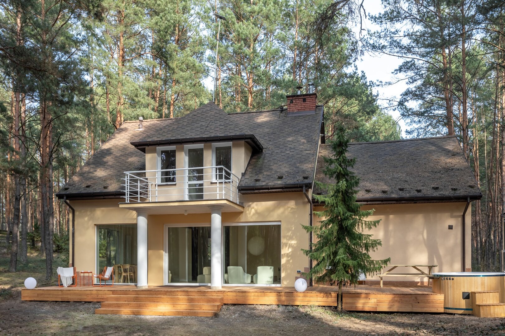 Dom stoi na ogrodzonej działce otoczonej lasem, co daje poczucie prywatności i bezpieczeństwa. Wokół nie ma zgiełku – jest za to przestrzeń na oddech, ruch i bycie tu i teraz.
